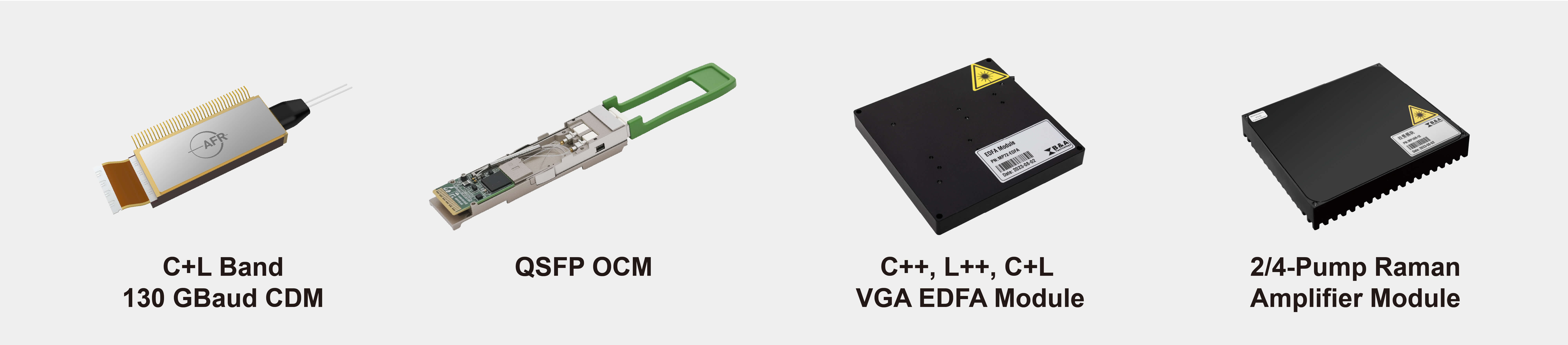 VGA EDFA Modules: The C++, L++, and C+L VGA EDFA modules support up to 120 (C++ and L++) or 96+96 (C+L) signal channels. With a broad gain range and rapid transient control, these modules enable highly flexible adjustments for both gain and output power.