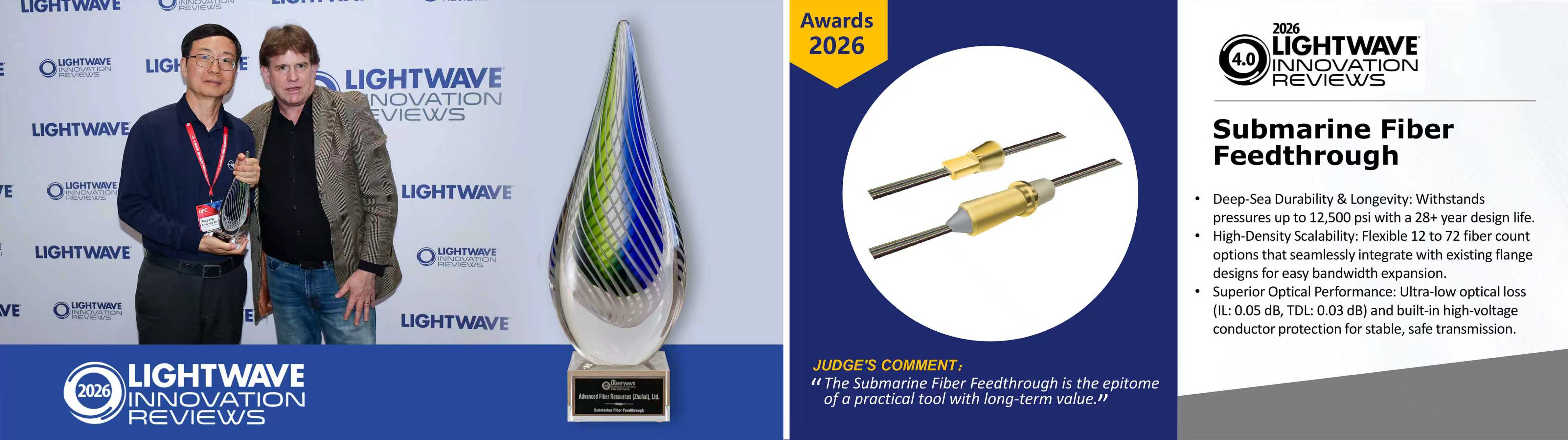 Submarine optical networks require core components built for harsh environments and long-term reliability. During the event, AFR's Submarine Fiber Feedthrough was honored by "Lightwave + BTR Innovation Reviews" award for its exceptional reliability and scalable design—key features that guarantee the enduring stability of subsea optical infrastructure.